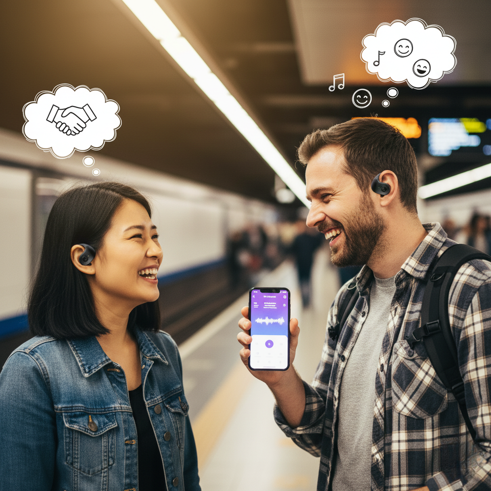 Our earbuds connect via Bluetooth to our dedicated app on your smartphone. When someone speaks, the earbuds capture the audio, send it to the app for instant AI translation, and then play it back in your ear in your chosen language, all in real-time.